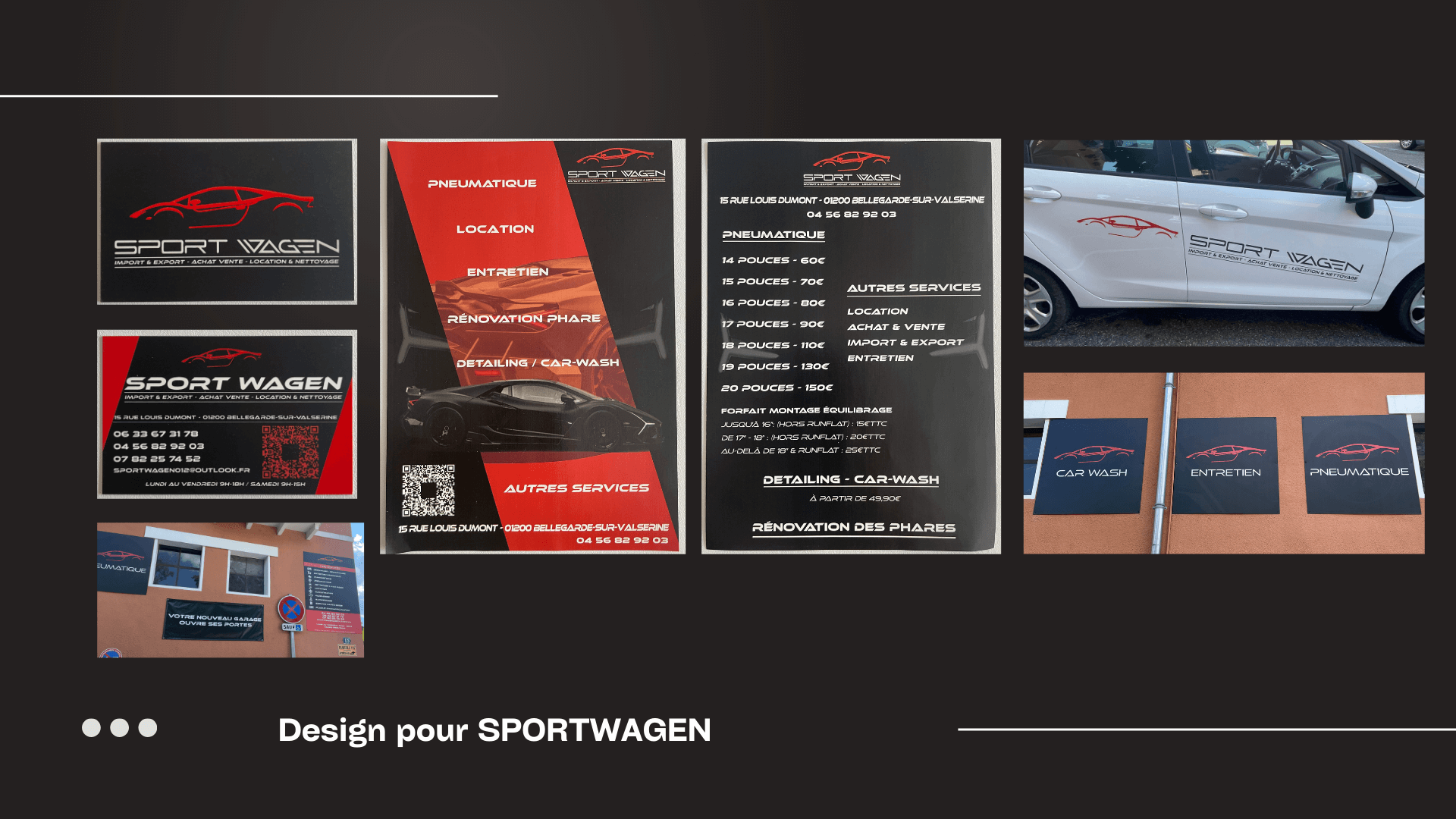 Le projet inclut également le flocage des véhicules, renforçant leur visibilité locale et leur identité de marque. Avec un design cohérent et une impression de qualité, Sportwagen bénéficie d’une communication professionnelle à 360°. Ces supports publicitaires physiques, associés à un design soigné, garantissent une présence forte, une notoriété locale renforcée et une image de marque moderne et percutante.